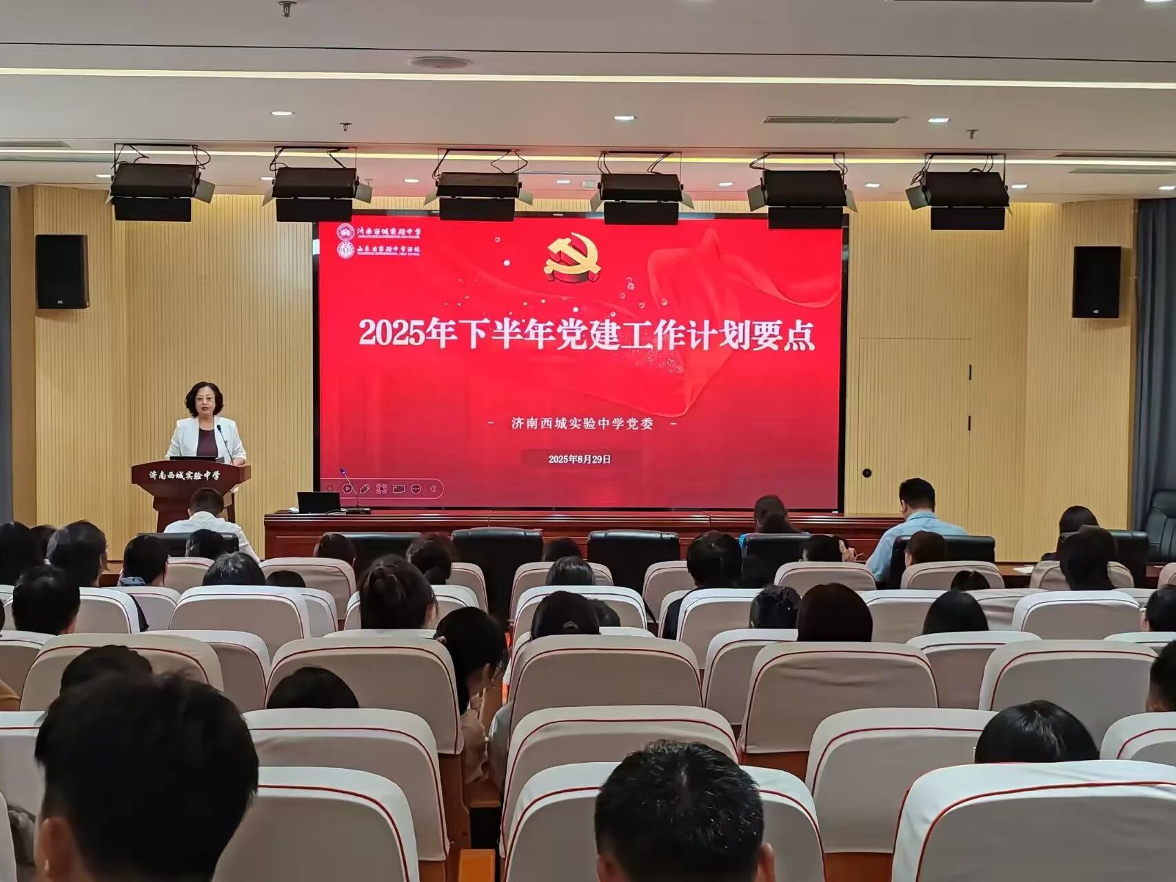 近日,济南西城实验中学召开全体党员大会,学校党委书记王蕾在会上传达2025年下半年党建工作计划要点,学校两校区全体党员参加会议。