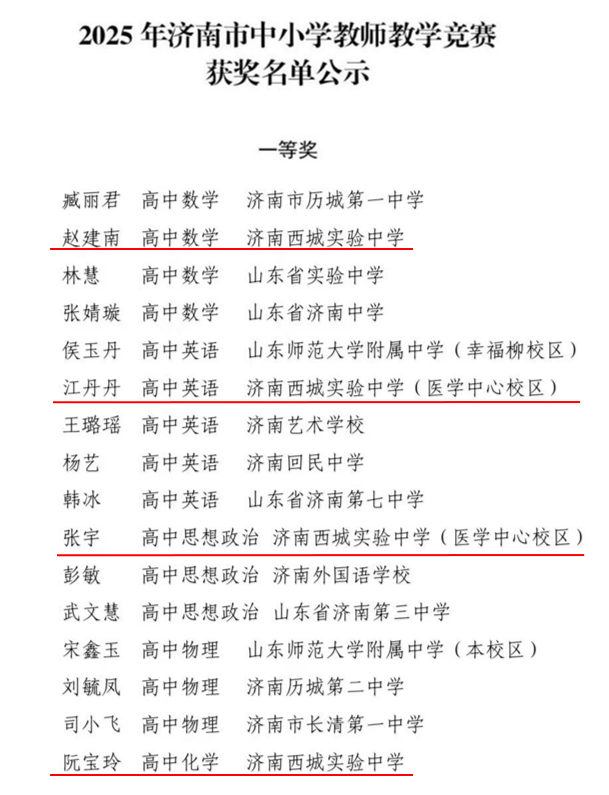 近日,2025年济南市中小学青年教师教学竞赛结果揭晓,我校推选的四位青年教师凭借扎实的学科素养、创新的教学设计与生动的课堂呈现,在全市各学科组激烈角逐中脱颖而出,全部斩获一等奖。佳绩的取得,不仅彰显了我校教师队伍的专业实力,更是学校长期深耕教研创新、聚力新备课组建设与“教学评一体化”新课堂改革的生动实践成果。