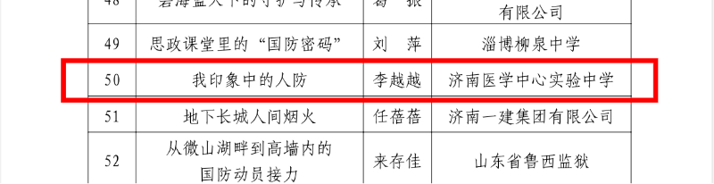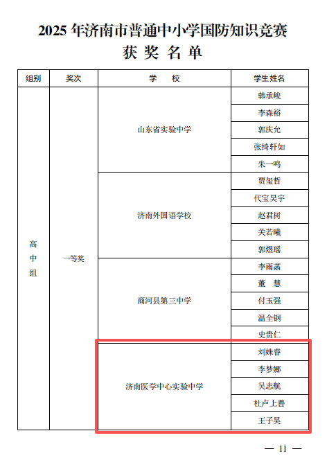 在济南市教育局、市委宣传部等4部门主办的2025年济南市普通中小学国防知识和军事技能竞赛中,我校10位学生获奖:刘姝睿等五位同学获得一等奖,陈皓宇等五位同学取得二等奖;孙哲老师获优秀指导教师奖。