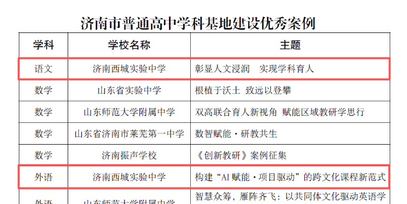 会上,《汇智·拓新:济南市高中“学科基地+新备课组”实践精粹》正式公布收录案例名单,我校语文学科基地申报的《彰显人文浸润 实现学科育人》案例和英语学科基地申报的《构建“AI赋能·项目驱动”的跨文化课程新范式》案例,凭借扎实的实践成效、鲜明的创新特色和突出的育人价值,成功入选优秀案例,充分彰显了我校在学科基地建设与“新备课组”改革中的扎实探索与丰硕成果。济南西城实验中学将以此次荣誉为新起点,深入总结学科基地建设与“新备课组”改革的实践经验,深化案例成果的提炼与推广,推动各学科协同发展,擦亮学科建设品牌,为济南高中教育高质量发展贡献西城力量。